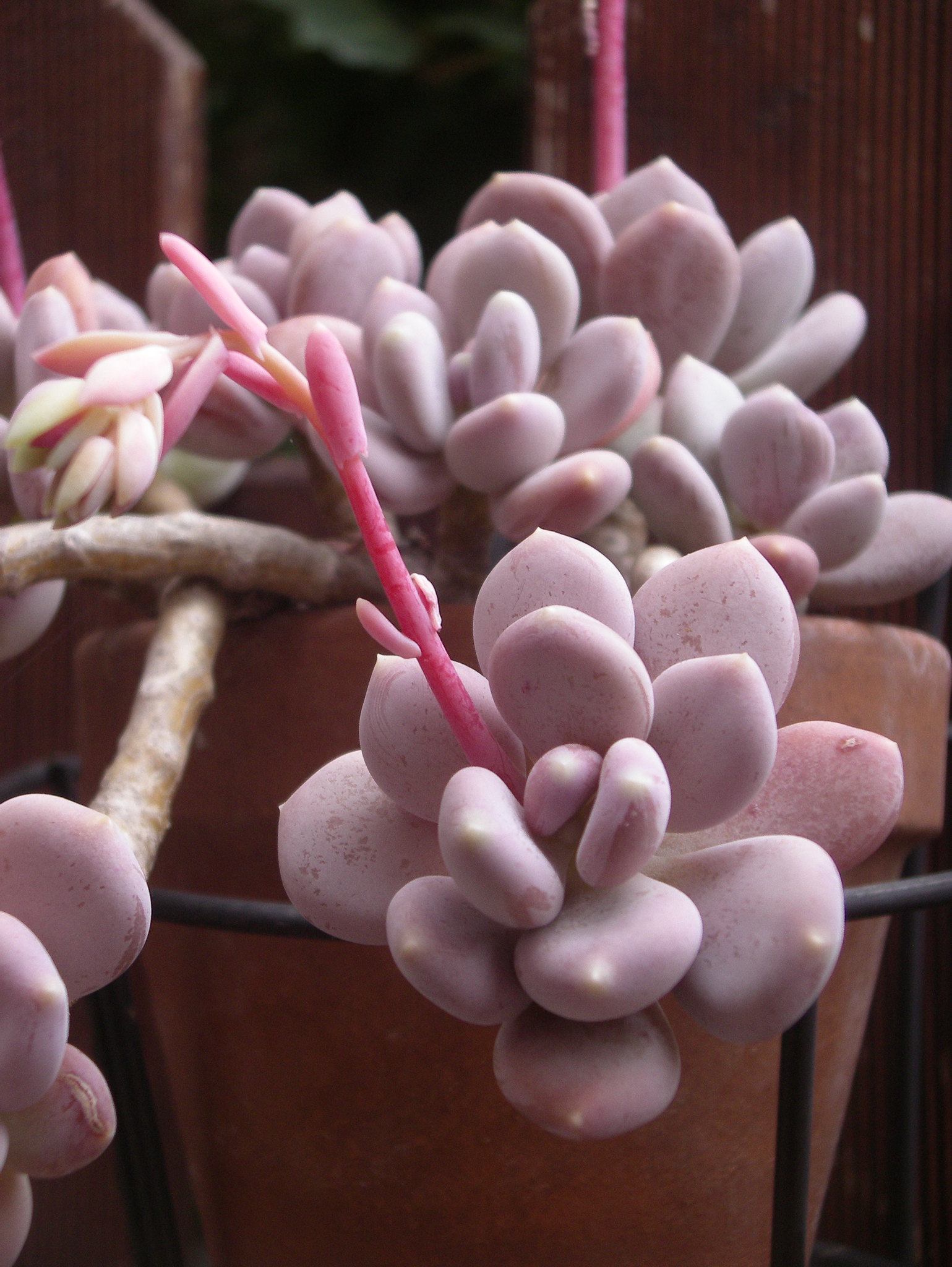 茎直立肉质茎,易群生,叶互生,排列成延长的莲花座,叶片呈倒卵型,长2-5厘米,先端有轻微的叶尖,叶背面圆凸,正面较平,叶片表面覆盖白粉。