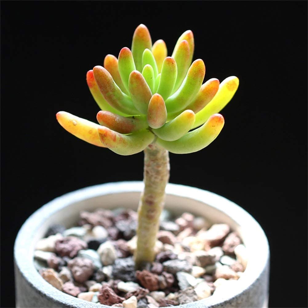 多年生肉质植物,植株呈小灌木状,高20-30厘米,多分枝。叶片松散地簇生于分枝顶部,叶肉质,圆柱形,表面平整光滑,稍向上内弯,顶端圆钝较基部稍细,叶长3-4厘米,粗约0.6厘米,叶色灰绿或浅蓝绿色。