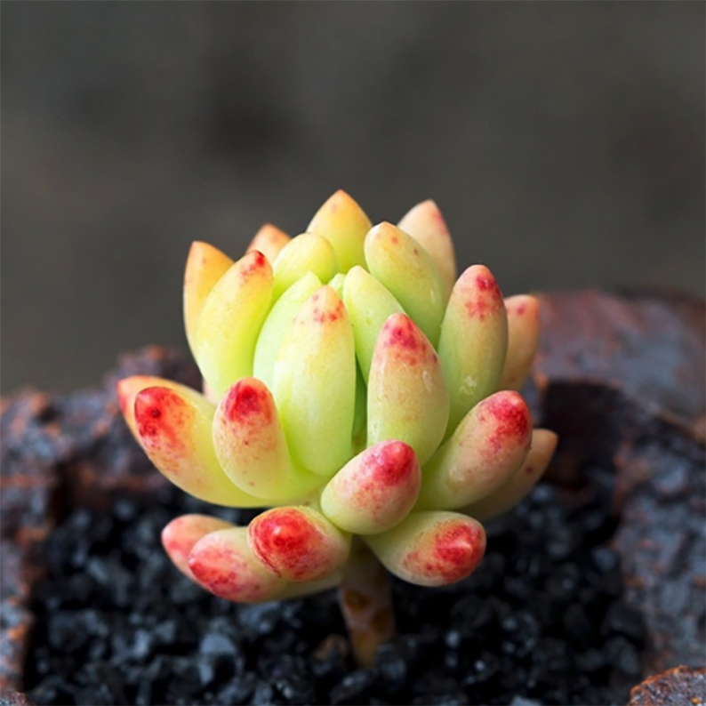 叶片披针形,轮生,放射状排列,肉质肥厚,草绿色、粉绿色,出状态时变成果冻色,叶面被薄霜,有红晕,叶尖呈现漂亮的红色。花期春季,聚伞花序,开黄色星状花朵。