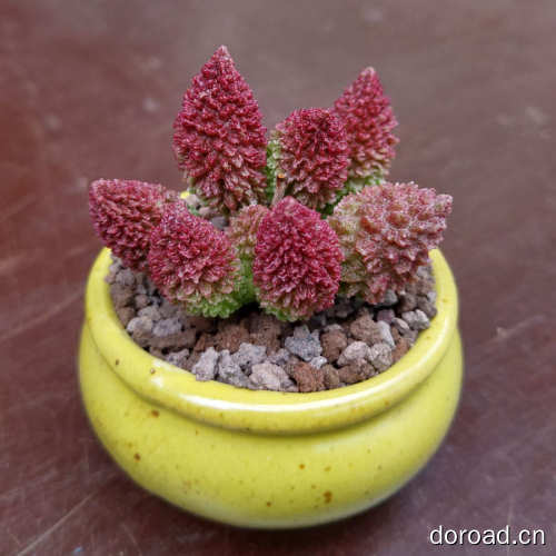 朱唇石植株小巧可爱,肥厚的肉质叶上布满疙瘩,十分奇特,而生长多年的植株,根部会形成古朴苍劲的块根,观赏价值很高。