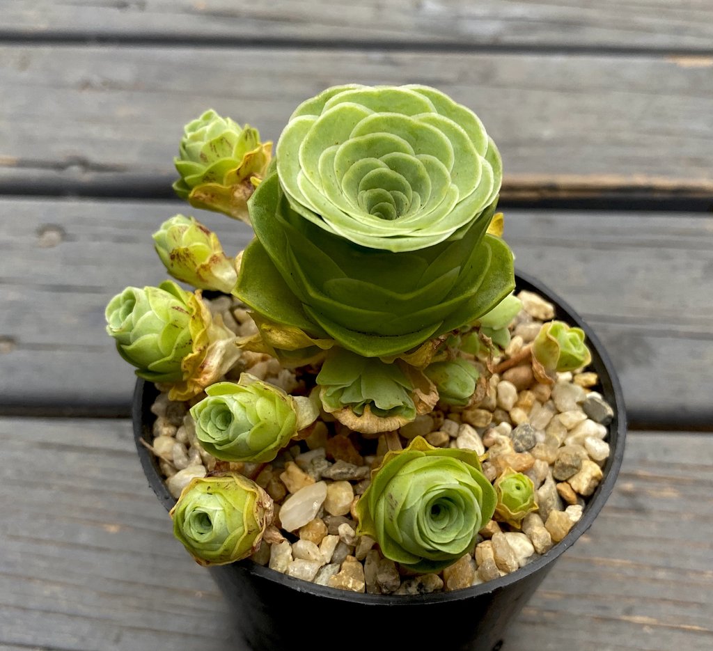 肉质叶互生,呈莲座状排列,顶部圆形,基部宽楔形,无毛,有白霜,边缘透明,偶尔有一些微小腺毛,浅绿色。叶子在冬天会齐平,在夏天会紧紧地结成圆形。