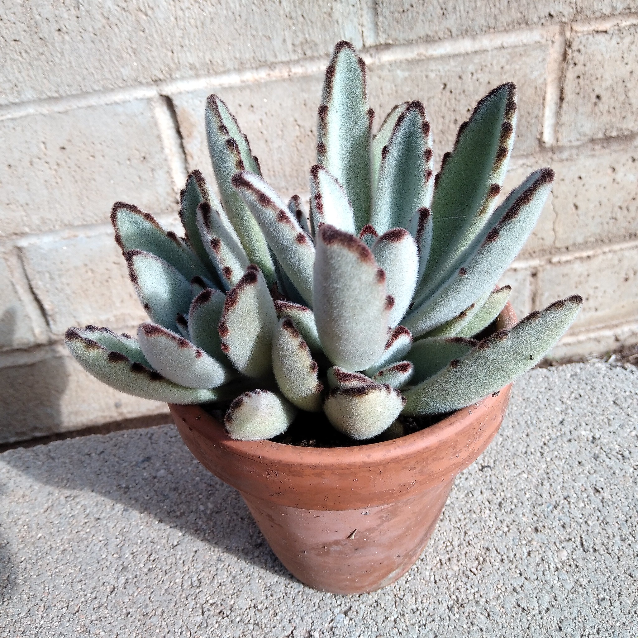 月兔耳的叶片形状非常奇特可爱,像兔子的耳朵一般,且叶片表面有很多绒毛,叶片边缘还有褐色斑纹,故有“月兔耳”之称。月兔耳的叶片上的小绒毛很容易沾上灰尘,可以用喷壶喷掉。