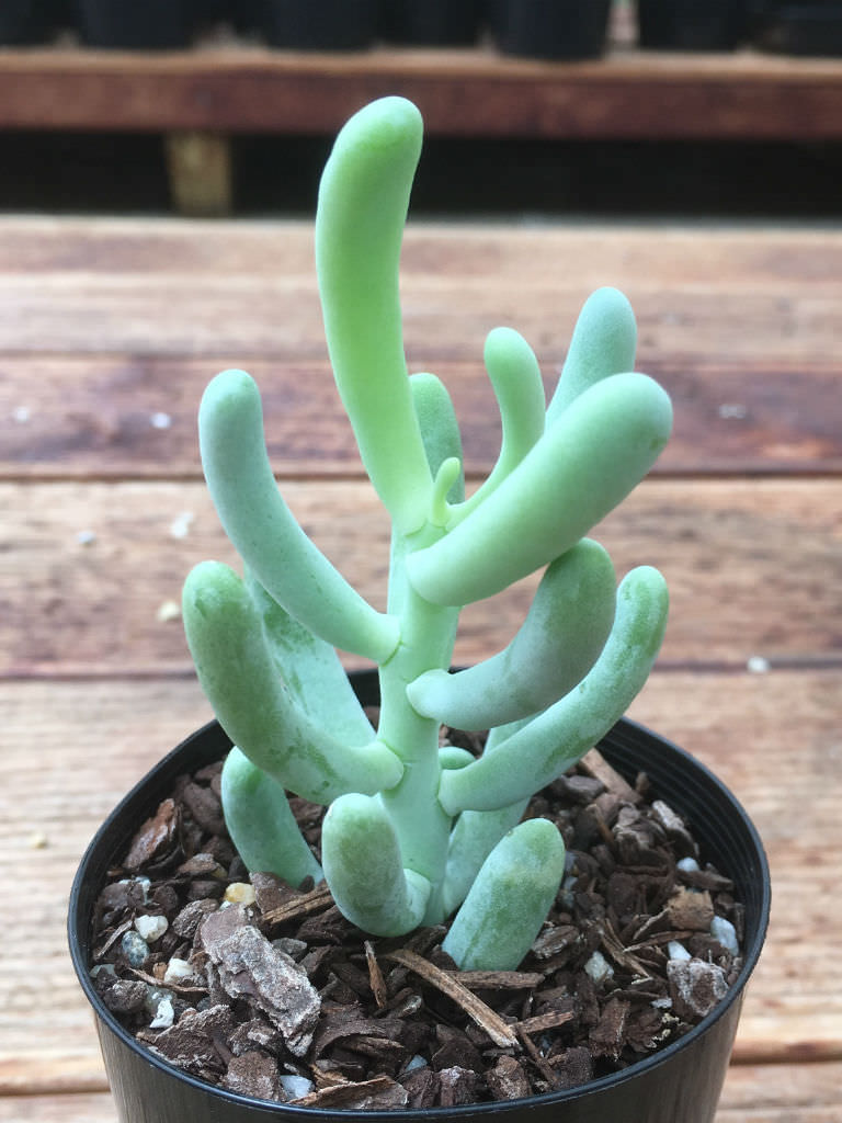 植株叶片颜色为淡蓝色。叶片长匙形,环状互生,叶片上下排列有点距离,叶片先端微尖,叶片较厚,基部圆。叶子颜色在强光与昼夜温差大或冬季低温期叶色会变成嫩绿色,弱光则叶色浅蓝,叶片变的窄且长,枝条也容易徒长。叶片覆盖有微白粉,光滑状,簇拥花序,开白红相间的花朵,五角型,花朵向上开放。