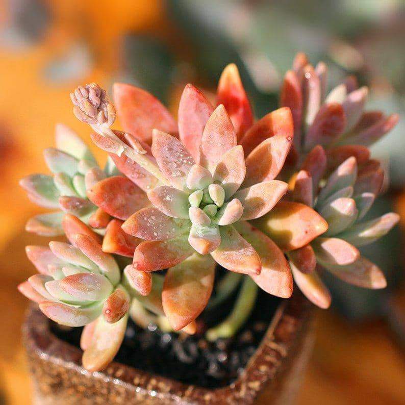 叶片较细长,正面平滑微下凹,背面明显突起似龙骨状,顶端稍尖,但整体仍较圆润。秋丽生长速度相对较快,叶片轮生呈莲座状,下部叶片容易枯去掉落,之后又会从茎干下部萌生侧芽,形成群生。秋丽叶片通常呈灰绿色,被轻微的白粉,春秋冬季节,在充足的光照下叶色很多变,呈现出粉、橙、红、紫、黄等多种颜色。花期春季,聚伞花序,开黄色星形五瓣或六瓣小花,十分清新可爱。