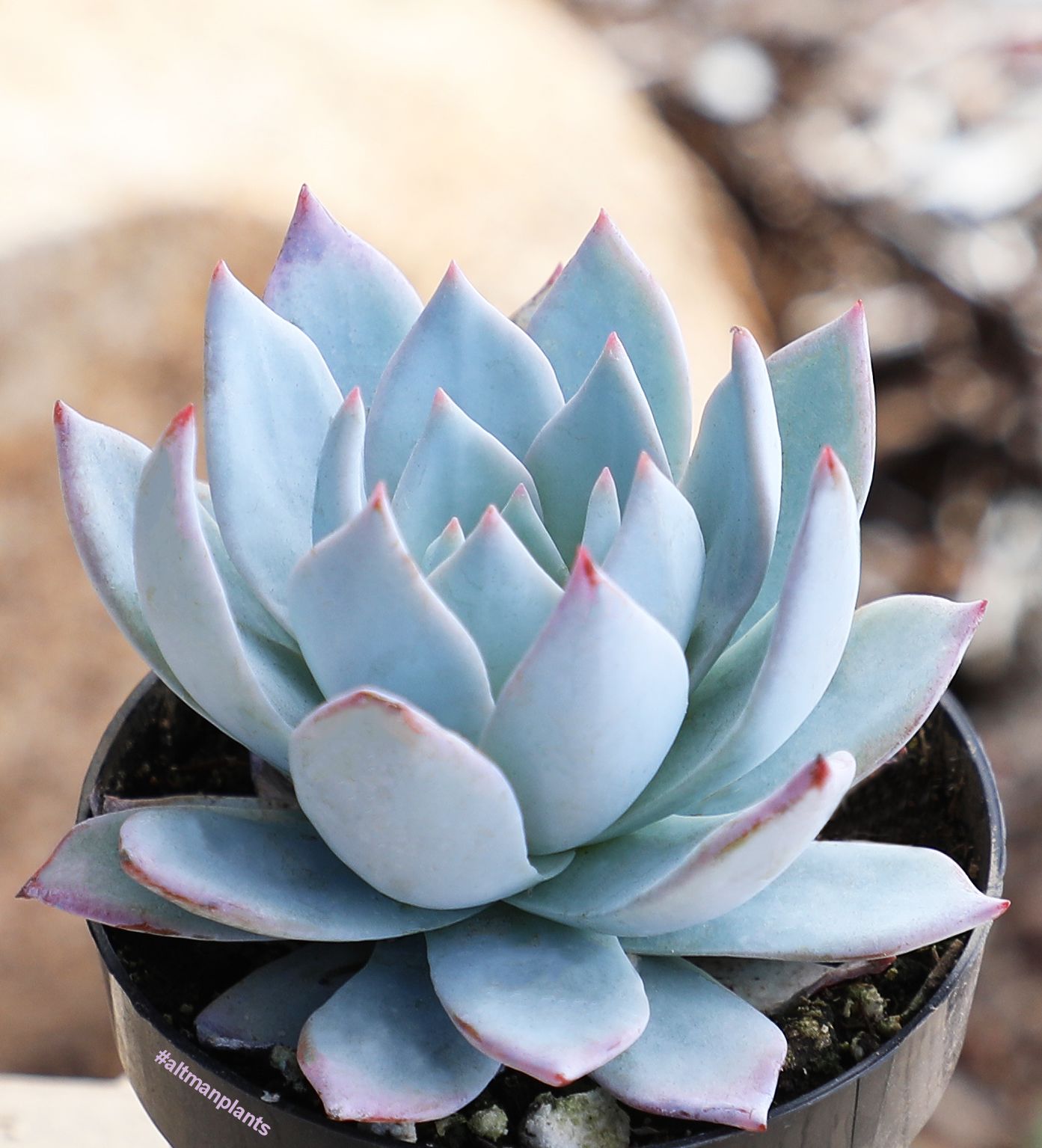 成株直径10-15厘米。茎部一般短于10厘米,直径1.0-1.5厘米,分枝较少。成株具24-50枚叶,呈莲座状紧凑排列。叶片呈狭卵形或倒卵形,顶部有尖,长约2.0-5.0厘米,宽约1.0-2.5厘米;某些个体叶宽达3.5厘米。1-4根蝎尾状聚伞花序,可长达30厘米或以上。花梗长约2毫米。花冠呈尖锐的五角形。长约11毫米,基部直径约8毫米,粉色且被白霜。