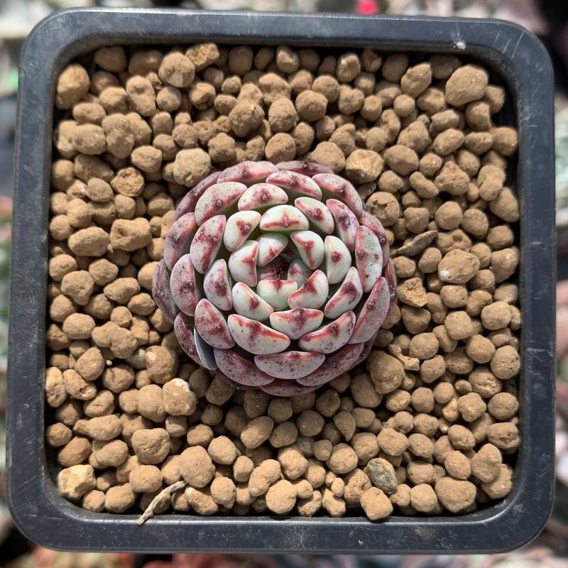 茎通常短于3厘米,会分株。莲座直径3.5 - 4 厘米。叶呈莲座状紧密排列,倒卵形,先端急尖,0.8-2.0 × 0.5-0.9厘米,直径2-4毫米,抹去叶片表面霜粉后呈灰绿色,叶尖与叶缘会在阳光强且有一定温差的环境下变红。每根莲座具1-4根花葶,每根3-7朵花,底部末端距第一朵花处1.2-3.5厘米,蝎尾状聚伞花序。花梗长3-6毫米。花萼片与花冠近垂直。花冠基部8.5-11×5-7毫米。花瓣先端黄色,近基部处粉红色。