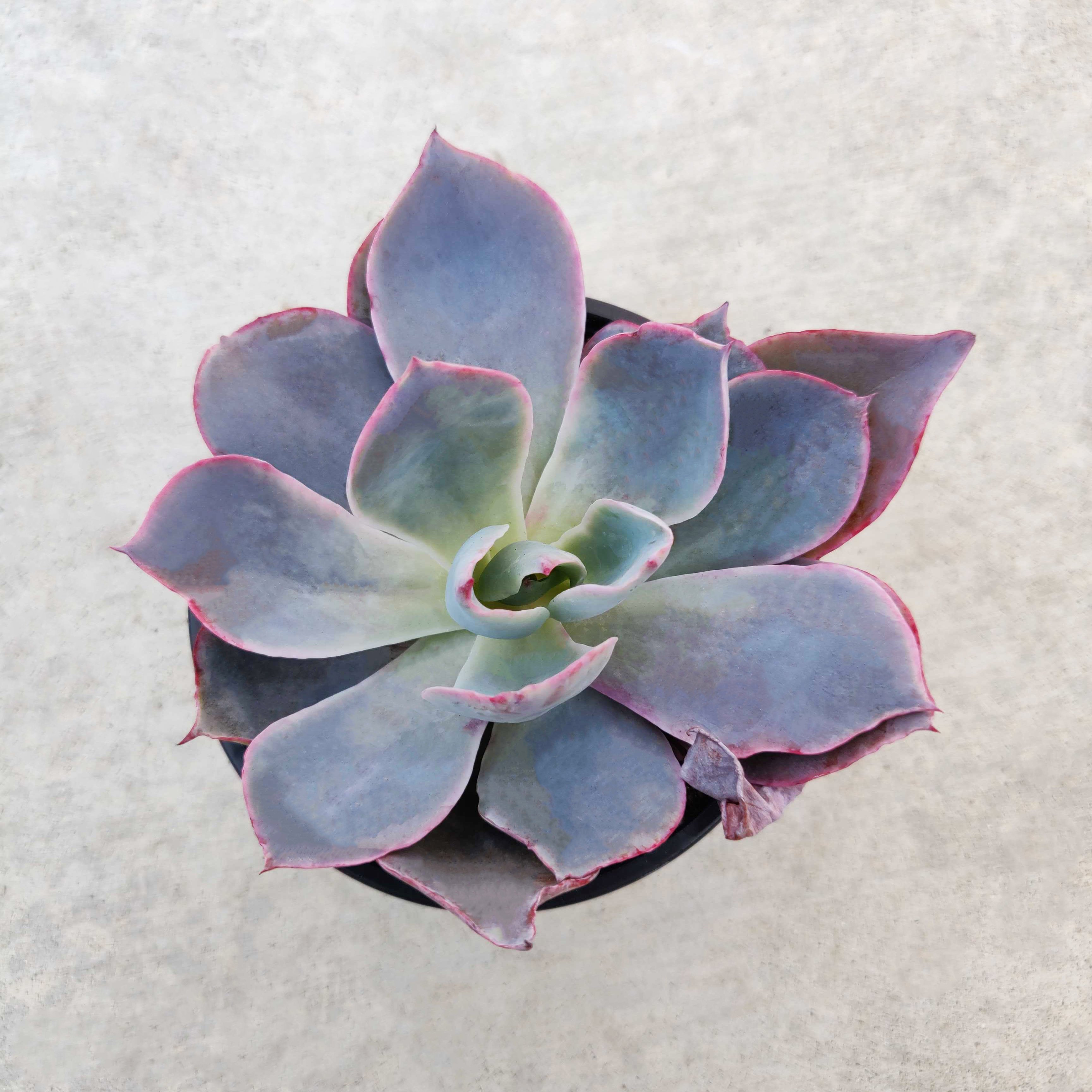叶片紧密环形排列,棱角分明。叶面光滑有白粉,叶尖到叶心可以看到有轻微的折痕,把叶片一分为二,叶缘非常薄,有点象刀口,微微向叶面翻转,叶缘会发红,叶片微蓝粉色或者浅紫粉色,新叶有点偏蓝,老叶就象晚霞一样的漂亮,叶面微白粉。