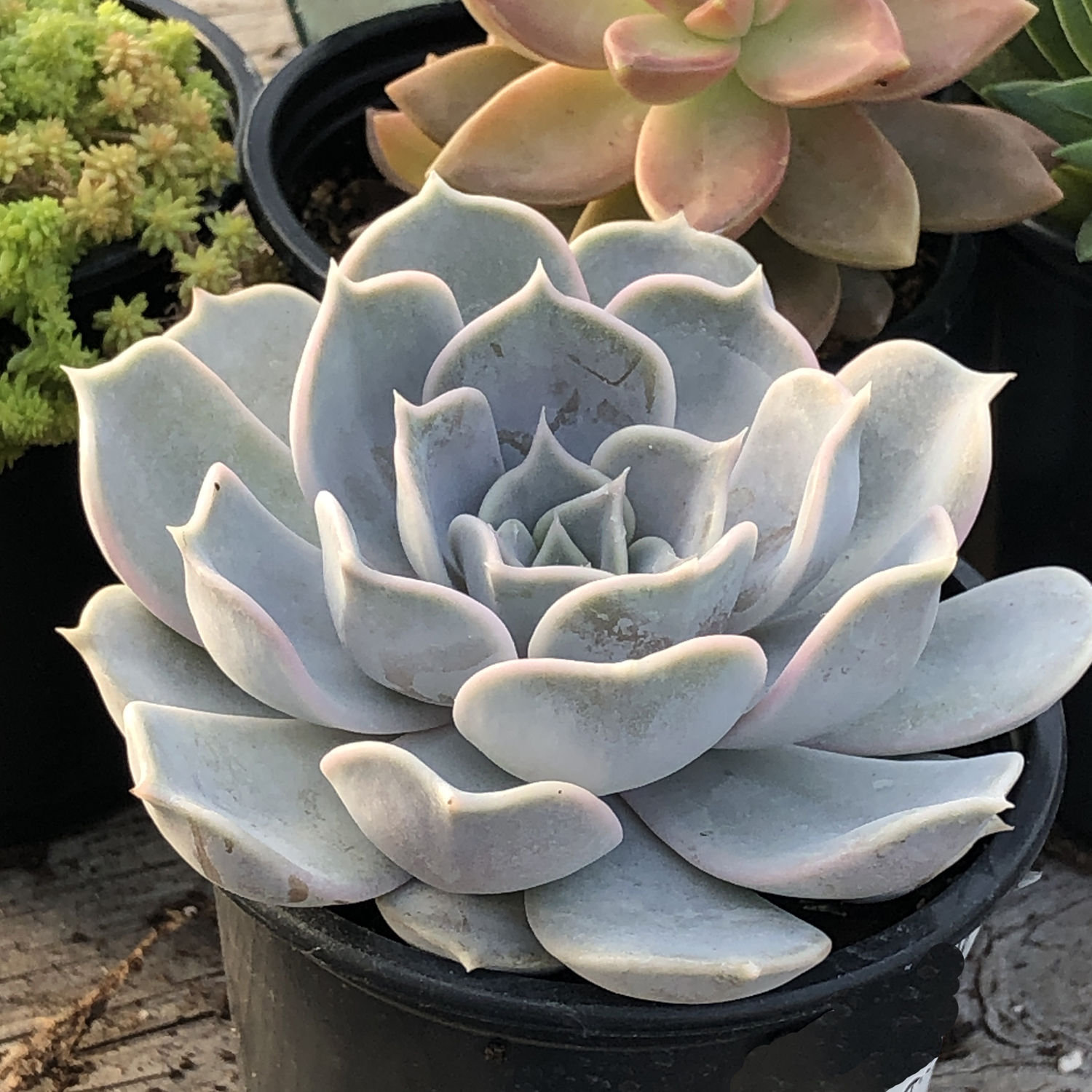茎长度小于5厘米,直径1.5厘米左右,自然生长情况下不分株。莲座直径11-17厘米。叶呈莲座状紧密排列,倒卵形至铲形,先端钝,有小短尖,长5-6厘米,最宽处2.5-3.7厘米,基部宽1-1.2厘米,表皮呈偏棕的暗绿色,被淡紫色至浅粉色的蜡质霜粉,叶缘透明。花序通常仅具1枝蝎尾状聚伞花序,有时具2枝。初期顶端内弯,后期直立。全长28-36厘米,直径3-5毫米。具14-26枚苞片,长8-18毫米,宽4-6毫米。花梗下垂,结种时直立,长9-27毫米,直径1毫米左右,粉色。苞片紧贴,先端上翘,长1.5-7毫米,宽1-4毫米,花冠瓮状,直径6-7.5毫米,花瓣三角形至披针形,急尖,长13-14毫米,宽4毫米左右,呈珊瑚粉色,先端向外急弯。株高5-6厘米,株幅10-25厘米,叶片卵圆形,叶顶端有尖头,叶片中间向内凹,叶片边缘呈粉红色尖尖。