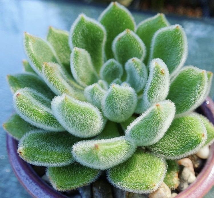 莲座叶盘无茎,老株易丛生。大的莲座叶盘由100片以上的叶组成。叶长5-7厘米、宽2厘米,基部狭窄,卵形并较厚,叶正面微凹、背面圆突,叶先端有微小的钝尖。叶绿色,叶端微呈红褐色,全叶被0.3厘米长的白毛。花序高20-30厘米,小花多,黄红色。