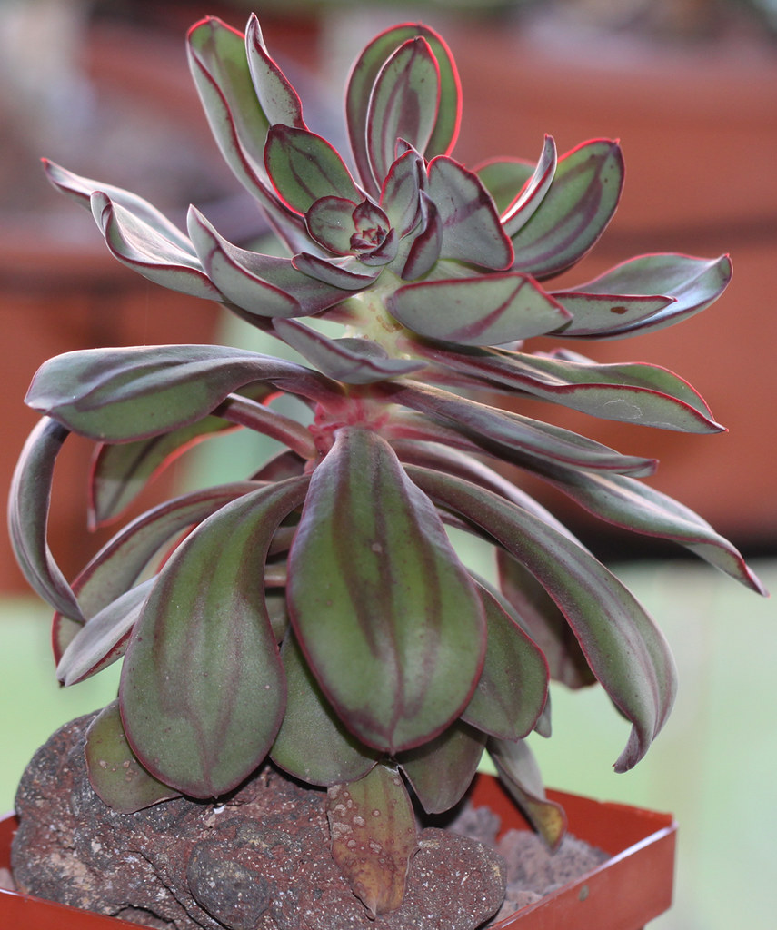 有着非常特别的红色花纹叶片,且叶片边缘也呈现红色,叶片背部有红色花纹或片状红色斑点,植株茎干有很多不规则棱角。光照不足的情况下,叶片会逐渐变绿色,但少有植株全绿。