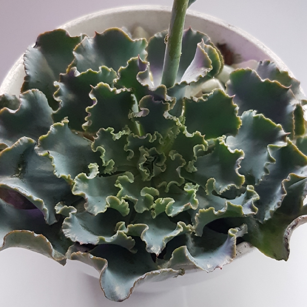 叶色翠绿至红褐,新叶色浅、老叶色深,强光与昼夜温差大或冬季低温期叶色深红,弱光则叶色浅绿,叶缘呈大波浪状,常会显现紫红色。新叶有薄霜粉覆盖。偶有侧芽。聚伞花序,长50~100厘米,花通常呈粉色。