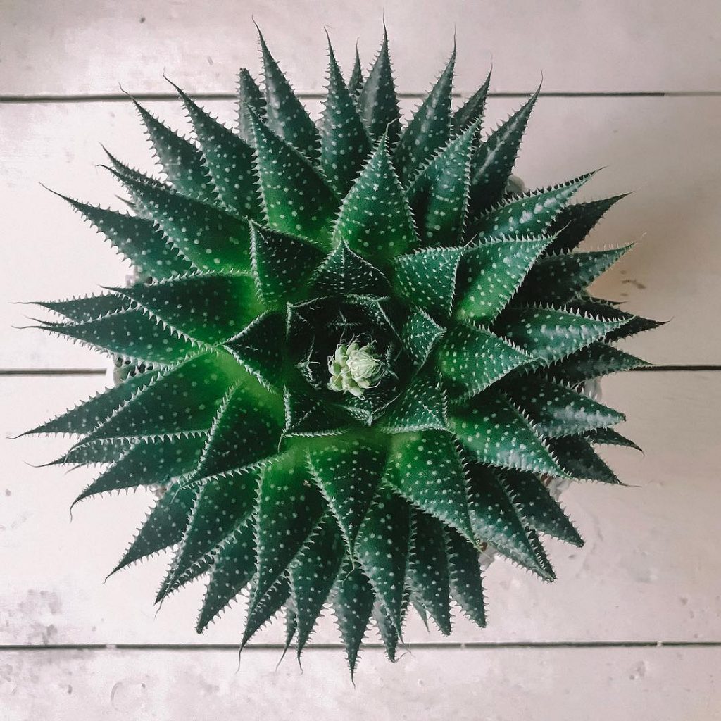 多年生肉质草本。莲座叶盘径20厘米左右,叶片多达40-50片,排列紧凑。叶深绿色,叶尖稍红,三角形带尖,叶长7-8厘米,基部宽3厘米,叶背上部有2条龙骨突,布满白齿状小硬疣。叶背面下部有1条龙骨突,截面呈三角形,叶缘也布满白色小疣。花序高,花基部红色,先端绿色似鲨鱼掌。