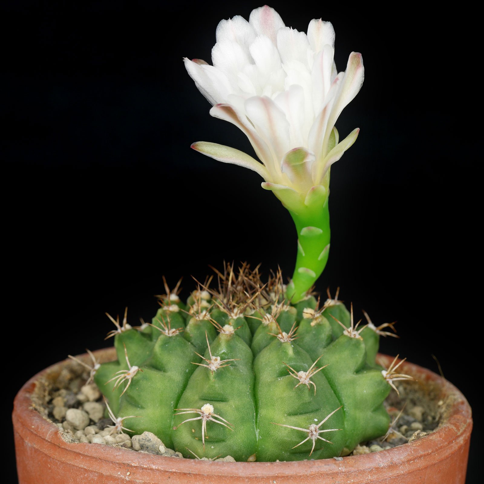 植株单生,后易萌生仔球,扁圆球至圆球形,球径10-12cm,体色灰绿色。具11-13个脊疣突的棱。黄白色细针样刺5-7枚,长3-5cm。春夏季节顶生粉白色漏斗状花,花径3-4cm。