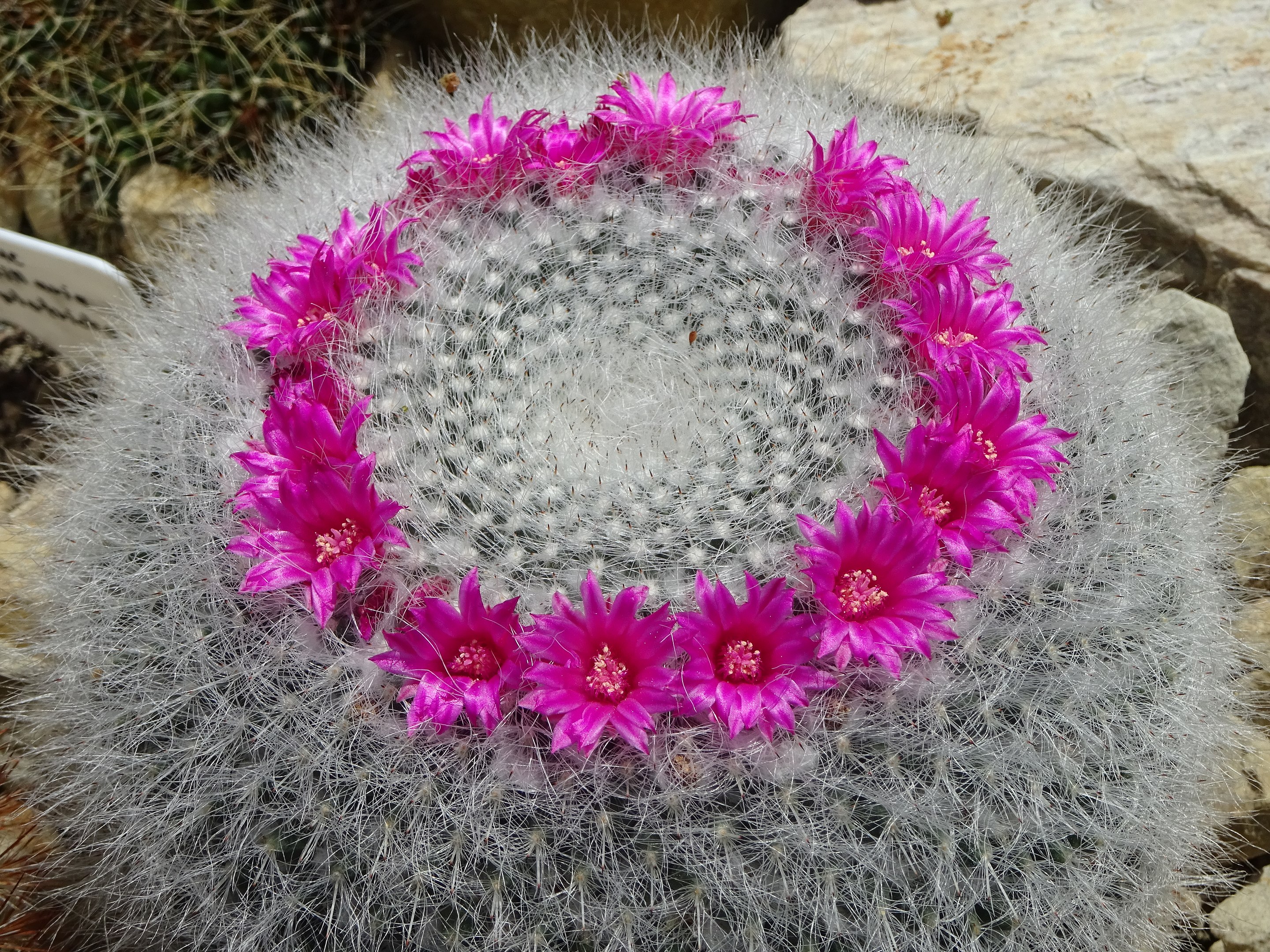多年生草本多浆植物。植株幼时呈扁球形或球形,以后长成圆筒状,直径10厘米左右,淡绿色。疣状突起呈圆锥形,新刺座的白色绵毛很短,疣突腋部则有20根白色长绵毛,绵毛长4厘米左右,弯曲伸展,将球体覆盖,使整个球体呈银白色绵毛球,非常美丽。每个刺座有周刺20-30根,长0.5-1.5厘米,白色;中刺2-3根,长1.5-2厘米,尖端褐色。花紫红色,花径1.5-2厘米,漏斗形。果实紫粉色,种子黑褐色。