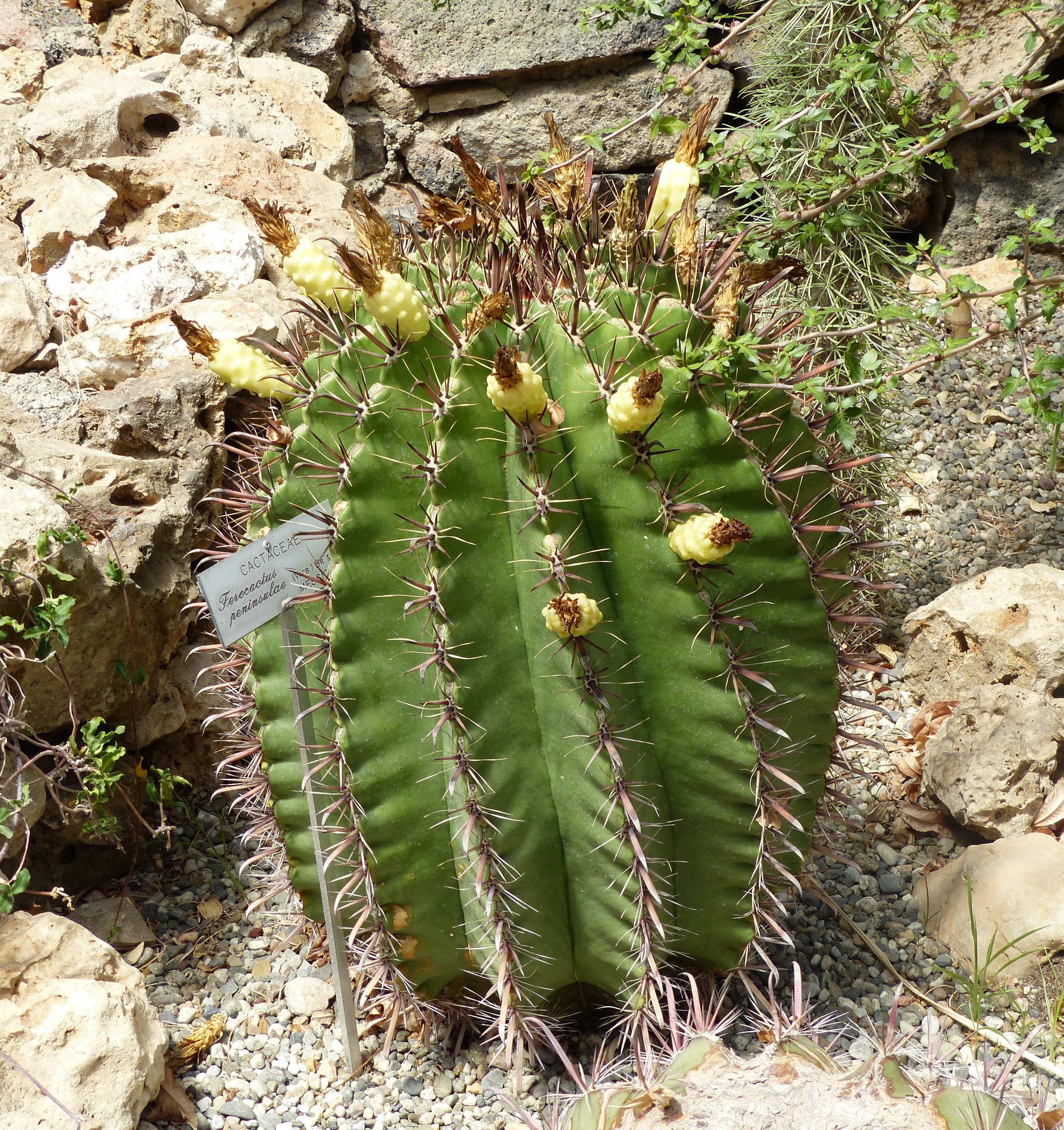 植株初始为短圆筒形,长大后呈短圆柱状。体色青绿色,表皮坚厚。球径30cm左右,高可达80-100cm,具13个脊高且薄的棱,棱峰上的刺座大又突出。白色刚毛状的周刺10-12枚,中刺4枚,中间1枚主刺呈扁锥形,有环纹,末端具钩。新刺红褐色,老刺褐灰色。春末夏初顶生橙黄色钟状花,具红色中脉,果实柠檬黄色,种子黑亮。