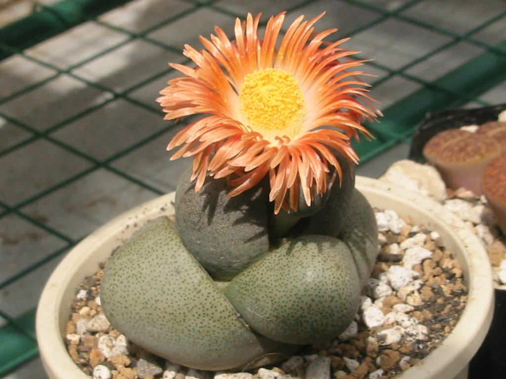 多年生肉质草本植物。植株矮小,无茎,叶极度肉质化,交互对生,叶圆卵形,基部合生,呈元宝状,新叶从合生处萌发;1株由约2-3对叶组成,叶灰绿色,夏季有时呈红色,表面光滑,密布透明小亮斑点,叶背隆起;花单生,具短梗,有芳香气味,花蕊黄色,花瓣先端橙红色,后端白色或粉色,花极大,花径6-7厘米,多为午后开花;蒴果具9-15室,多为11室,成熟干燥后遇水爆裂,释放出细小种子。
