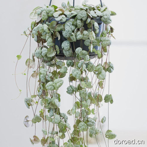 多年生草本植物,植株从带有结节的块茎中生出并匍匐生长,悬挂时茎叶会自然下垂。该种块茎呈灰色,木质化;质地坚硬、有褶皱。直径约5厘米。从中萌生出数根紫色、线状的匍匐茎。爱之蔓的匍匐茎最长可以达到1-2米,但通常不会超过45厘米。该种会在叶腋处长出圆形块茎,称“零余子”,有贮存养分、水分及繁殖的功用。新生的块茎可以为原有的匍匐茎分枝。 叶对生,长1-1.5厘米,宽约1.5厘米,沿匍匐茎排列,每隔约8厘米有一对。叶肥厚肉质,呈心形,叶柄较短。叶深绿色,叶面上有灰、白色网状花纹,叶背呈紫红色; 花朵自叶腋2厘米处生出,花较细长,壶状,颜色鲜艳,红褐色,长约2.5厘米。花托隆起,呈紫色。花后结出羊角状的果实。该种花期为春季、夏末至早秋,每朵花可持续开放约6周。
