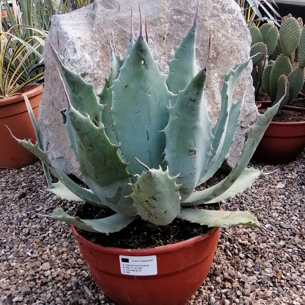植株高度20厘米,呈莲座状簇生。叶片长25厘米,青绿色披白粉。叶片根部狭窄肥厚,先端尖锐,且长有锈红色尖刺。叶片边缘分布多对波浪状短刺,整体呈倒卯状。夏季开花,黄绿色,呈漏斗状。