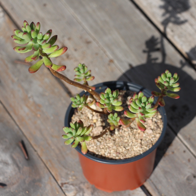 叶片排列松散;广卵形至散三角卵形;一般灰绿色,在阳光强、温差大的环境下,边缘和先端可呈现红晕;长达4厘米,宽达1.5厘米。