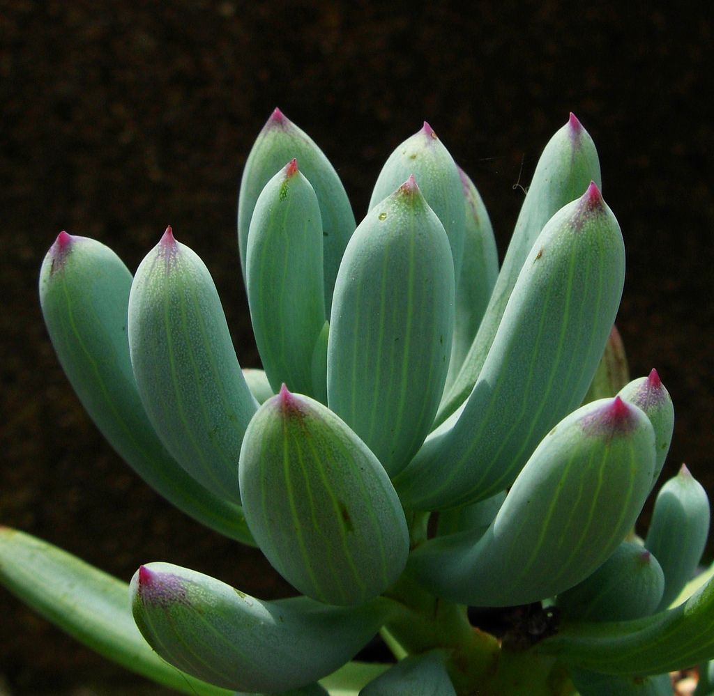 灰绿色,表面分布白色粉末,肉质肥厚,呈披针形。