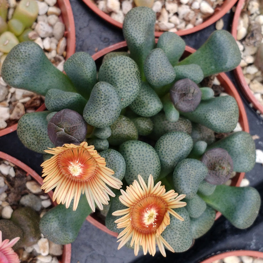 叶8-10枚直接从根基部长出,排列成松散的莲座状;肉质,很小,近似匙形,先端为浑圆的三角形,蓝绿或褐绿色,密布深色舌苔状小疣突。