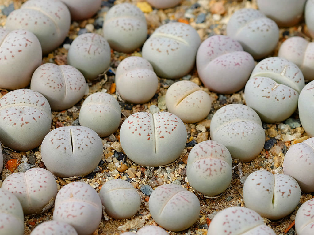 植株初为单生,以后蜕皮分头,成群生状,栽培中多为2-4头组成小群生。单株无茎,由2枚肉质对生叶组成,高4厘米,顶端平,有红色线状斑纹或斑点。叶色灰白至乳白,有时略带红色。