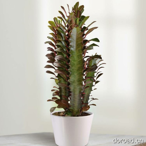 多分枝灌木,分枝全部向上生长。3-4棱,通常3棱,粗4-6厘米、长15-25厘米,但在栽培中分枝较细而更长。棱缘有坚硬短齿。表皮深绿色有白色晕纹。对生刺红褐色,0.3-0.4厘米长。在分枝上部每棱上都有卵圆形带短尖的绿色叶,叶长3-5厘米,叶质很薄。冬季寒冷时会落叶,翌年5月萌发新叶。