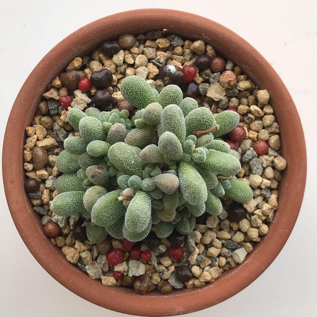 植株多年生,叶互生,排列成莲座状,近贴地;茎短,叶片以下长约1-2毫米。叶长4-10毫米,倒披针形至近倒锥形;先端钝,三角形至近圆柱状。