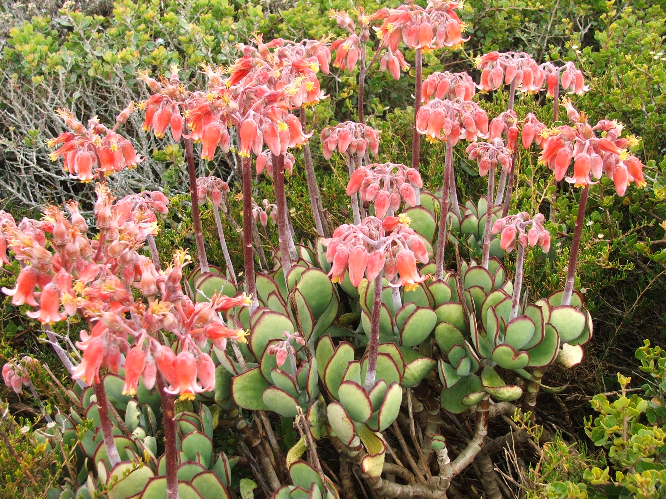 终年绿色,光照充足时叶片呈黄绿色,肉质叶椭圆形,边缘红色,光照不足时红边消失,不被粉。从冬末到初春开花,花橘红色,钟状,团簇倒垂。种子细小。