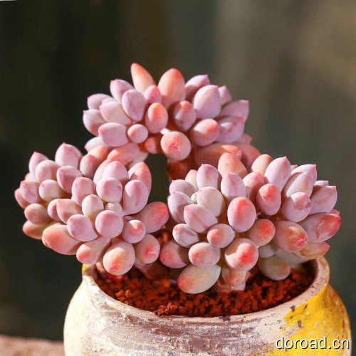 叶片互生,呈螺旋状排列,倒卵形至倒披针形,半圆柱状,先端有急尖。一般状态下叶片基部呈粉色,中部呈泛紫的浅灰色至蓝绿色,尖端颜色更浅。日照时间长且具一定昼夜温差的环境下可呈现较为鲜明的粉红色。