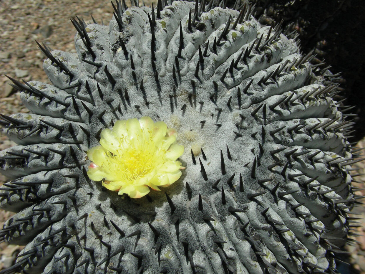 植株球形、圆筒形,有棱15到20。中央刺1-2个,径向刺无。刺座以及球体顶部多毛。刺为黑色。花开黄色,偶尔有粉红色或淡粉红色。黑王丸野生品种生长极其缓慢,这个物种表面有一层白色的蜡质层,但是一般养殖品种没有这一层蜡质层。