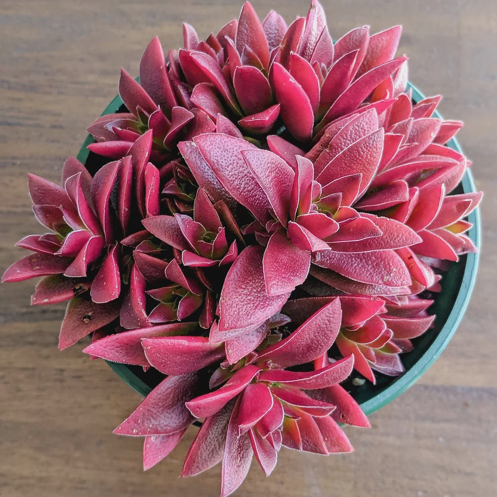 有白色的细小绒毛。新叶绿色,老叶褐红色或者暗红色,温差大的季节整个植株叶片呈现紫红色。