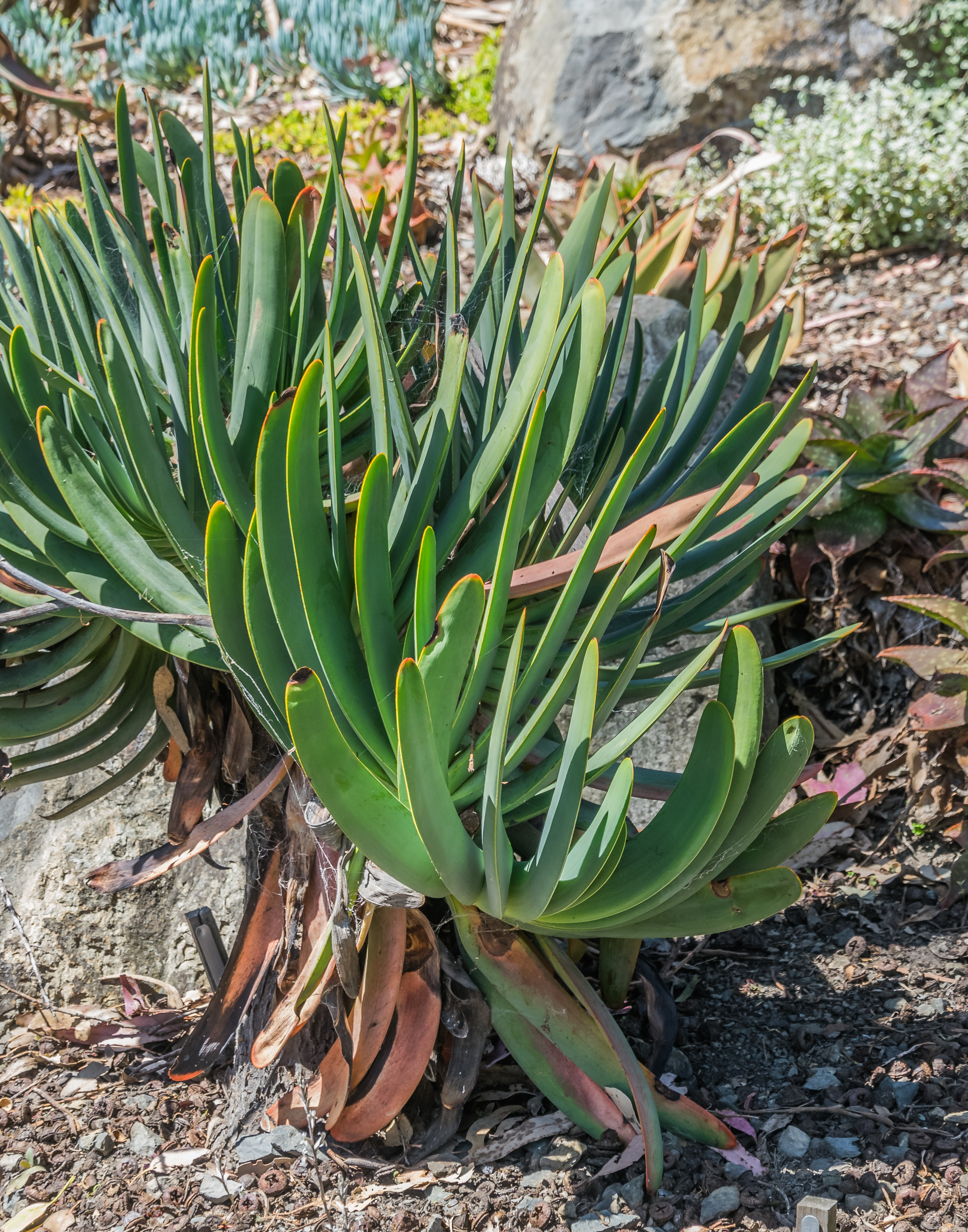 成株可达到3-5米的高度。茎分叉成两排相对排列,带状叶片。叶子颜色暗绿色或灰绿色,除了上部的一些小齿,叶片几近全缘。叶子长约300毫米,宽40毫米,汁液透明。总状花序的圆柱形,猩红色的花,每个长约50毫米,稍肉质。它在冬末和春天开花。