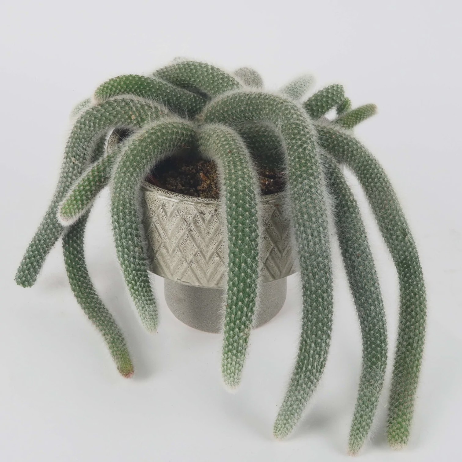 呈悬垂型的小柱状,柱体直径近2cm,可长达1.5m。标准的猴尾柱成年株披满长达4-5cm以上的白色长毛,形似猴尾,中文名由此而来,猴尾柱夏秋季开花,花长4-6cm,直径5cm,花瓣红色,花药深红色,柱头淡黄色。