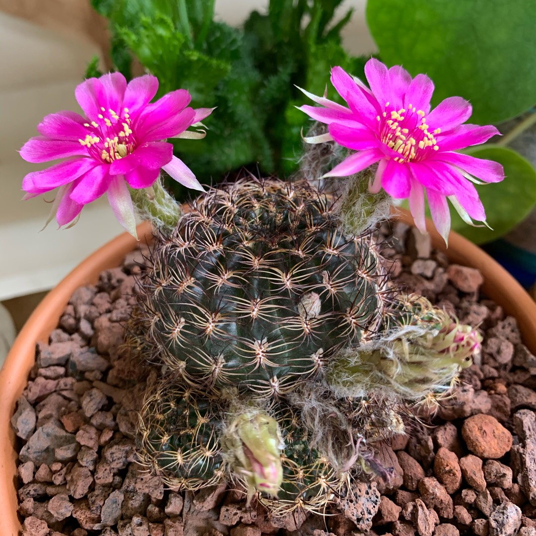 5厘米以上,幅径6厘米,小型种。茎灰绿色,上有16-81条棱,具有刺端棕色的褐色刺12-18枝,春季开花,花桃紫色。